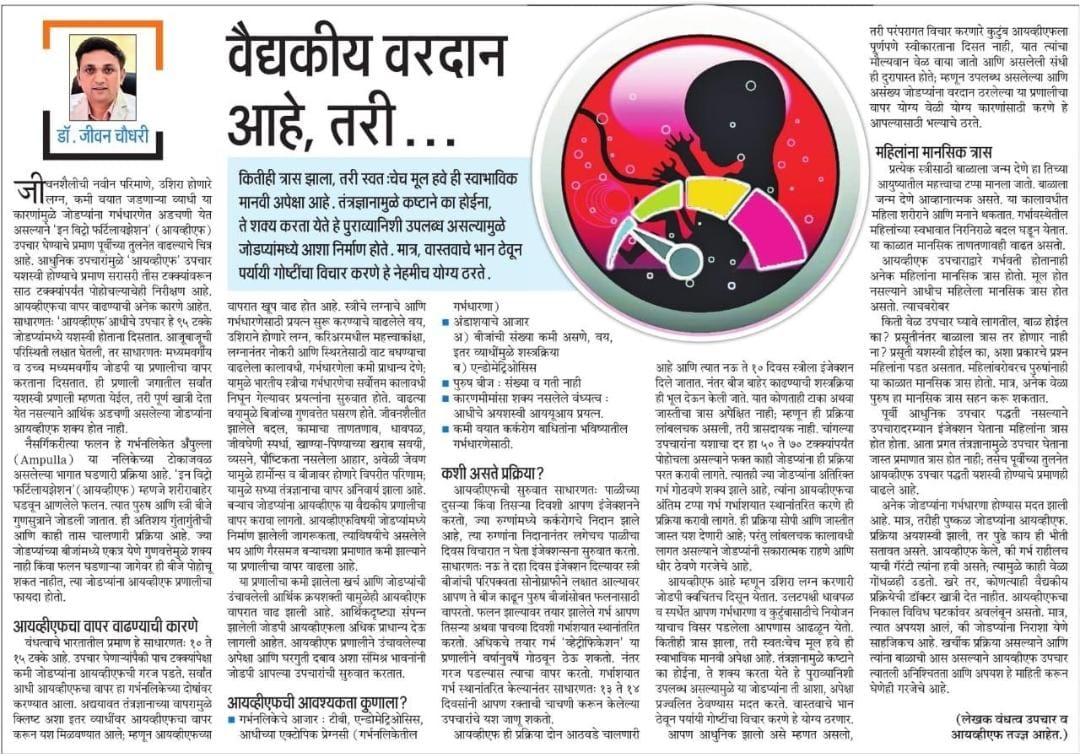 डॉ. जीवन चौधरी चनशैलीची नवीन परिमाणे, उशिरा होणारे कारणांमुळे जोडप्यांना गर्भधारणेत अडचणी येत असल्याने 'इन विट्रो फर्टिलायझेशन (आयव्हीएफ) उपचार घेण्याचे प्रमाण पूर्वीच्या तुलनेत वाढल्याचे चित्र आहे. आधुनिक उपचारांमुळे 'आयव्हीएफ' उपचार यशस्वी होण्याचे प्रमाण सरासरी तीस टक्क्यांवरून साठ टक्क्यांपर्यंत पोहोचल्याचेही निरीक्षण आहे. आयव्हीएफचा वापर वाढण्याची अनेक कारणे आहेत. साधारणतः 'आयव्हीएफ' आधीचे उपचार हे ९५ टक्के जोडप्यांमध्ये यशस्वी होताना दिसतात. आजूबाजूची परिस्थिती लक्षात घेतली, तर साधारणतः मध्यमवर्गीय व उच्च मध्यमवर्गीय जोडपी या प्रणालीचा वापर करताना दिसतात. ही प्रणाली जगातील सर्वांत येत नसल्याने आर्थिक अडचणी असलेल्या जोडप्यांना आयव्हीएफ शक्य होत नाही. वैद्यकीय वरदान आहे, तरी ... आयव्हीएफचा वापर वाढण्याची कारणे कमी जोडप्यांना आयव्हीएफची गरज पडते. सर्वांत आधी आयव्हीएफचा वापर हा गर्भनलिकेच्या दोषांवर करण्यात आला. अद्ययावत तंत्रज्ञानाच्या वापरामुळे क्लिष्ट अशा इतर व्याधींवर आयव्हीएफचा वापर करून यश मिळवण्यात आले म्हणून आयव्हीएफच्या कितीही त्रास झाला, तरी स्वत:चेच मूल हवे ही स्वाभाविक मानवी अपेक्षा आहे. तंत्रज्ञानामुळे कष्टाने का होईना, ते शक्य करता येते हे पुराव्यानिशी उपलब्ध असल्यामुळे जोडप्यांमध्ये आशा निर्माण होते. मात्र, वास्तवाचे भान ठेवून पर्यायी गोष्टींचा विचार करणे हे नेहमीच योग्य ठरते. गर्भधारणा) , ■ अंडाशयाचे आजार वापरात खूप वाढ होत आहे. स्त्रीचे लग्नाचे आणि गर्भधारणेसाठी प्रयत्न सुरू करण्याचे वाढलेले वय उशिराने होणारे लग्न, करिअरमधील महत्त्वाकांक्षा लग्नानंतर नोकरी आणि स्थिरतेसाठी वाट बघण्याचा इतर व्याधींमुळे शस्त्रक्रिया वाढलेला कालावधी, गर्भधारणेला कमी प्राधान्य देणे यामुळे भारतीय स्त्रीचा गर्भधारणेचा सर्वोत्तम कालावधी वयामुळे विजांच्या गुणवत्तेत घसरण होते. जीवनशैलीत झालेले बदल, कामाचा ताणतणाव, धावपळ जीवघेणी स्पर्धा, खाण्या-पिण्याच्या खराब सवयी व्यसने, पौष्टिकता नसलेला आहार, अवेळी जेवण यामुळे हार्मोन्स व बीजावर होणारे विपरीत परिणाम यामुळे सध्या तंत्रज्ञानाचा वापर अनिवार्य झाला आहे भय आणि गैरसमज बऱ्याचशा प्रमाणात कमी झाल्याने या प्रणालीचा वापर वाढला आहे. , अ) बीजांची संख्या कमी असणे, वय, ; ब) एन्डोमेट्रिओसिस पुरुष बीज संख्या व गती नाही आधीचे अयशस्वी आययूआय प्रयत्न. ■ कमी वयात कर्करोग बाधितांना भविष्यातील , गर्भधारणेसाठी. कशी असते प्रक्रिया ? आयव्हीएफची सुरुवात साधारणतः पाळीच्या दिवस विचारात न घेता इंजेक्शन्सना सुरुवात करतो. साधारणतः नऊ ते दहा दिवस इंजेक्शन दिल्यावर स्त्री बीजांची परिपक्वता सोन